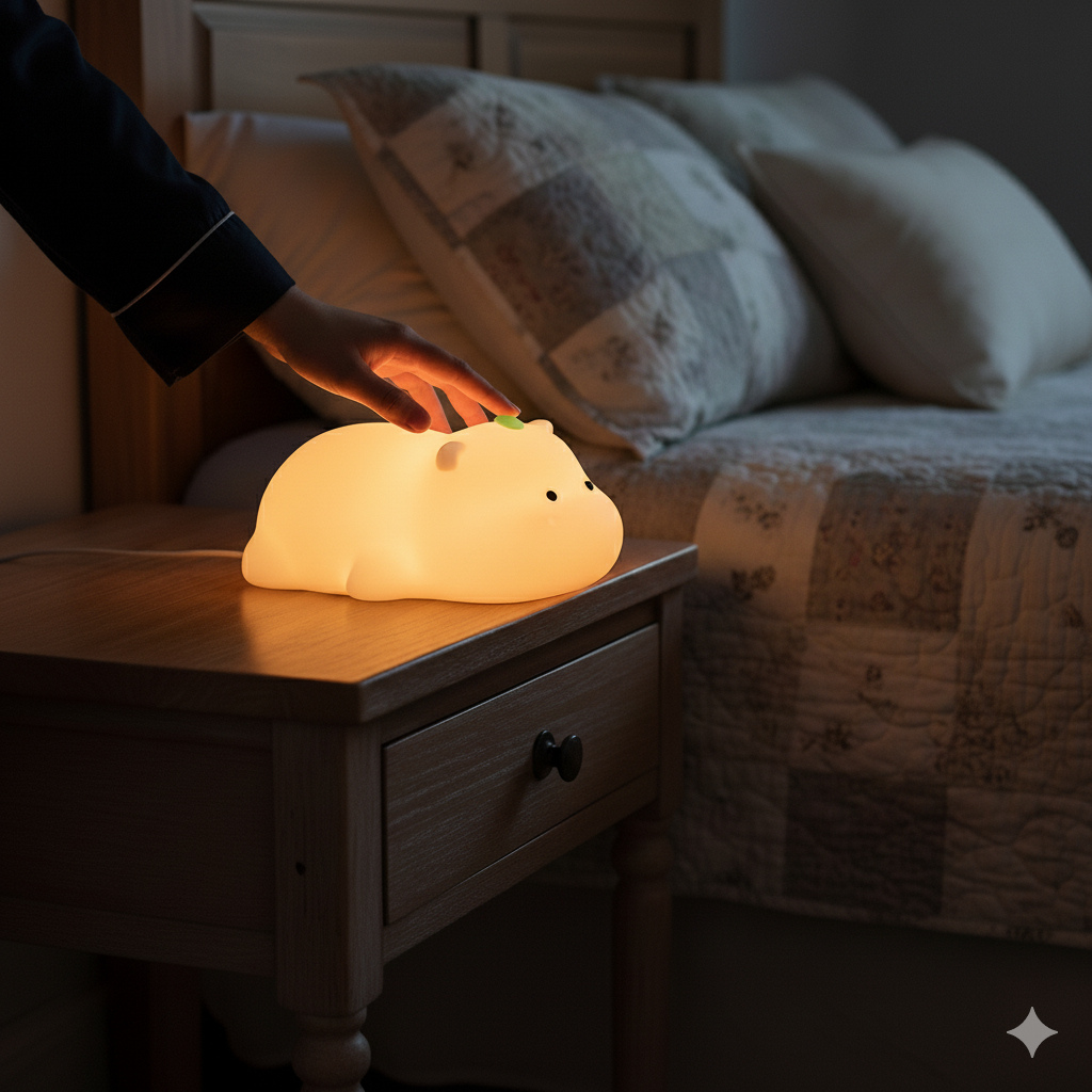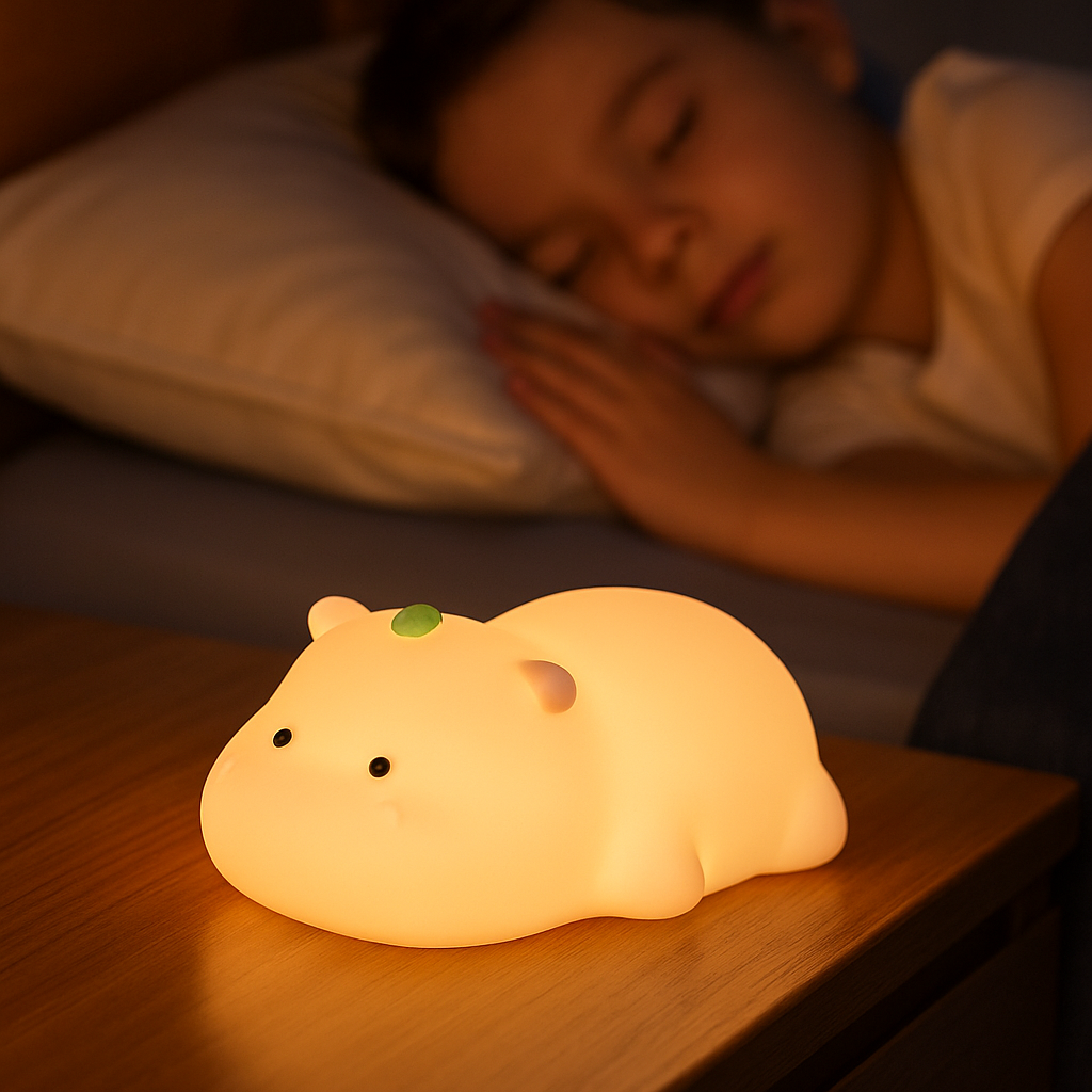 Huddy’s the happiest little hippo around — round, squishy, and always glowing with good vibes. He loves lounging beside you, spreading warmth and calm with his soft, rosy light. Whether it’s story-time or snooze time, Huddy’s gentle glow turns every night into a cozy, dream-filled adventure